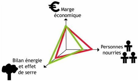 L’intégration de la performance nourricière dans les indicateurs de suivi d’une exploitation agricole a été initiée dans le modèle Perfagro P3 développé par le CEREOPA depuis 2008, et qui permet de rechercher des solutions optimales en termes de marge économique, de performances environnementale et nourricière, en explorant différents choix de production (nature des activités et itinéraires techniques de production).