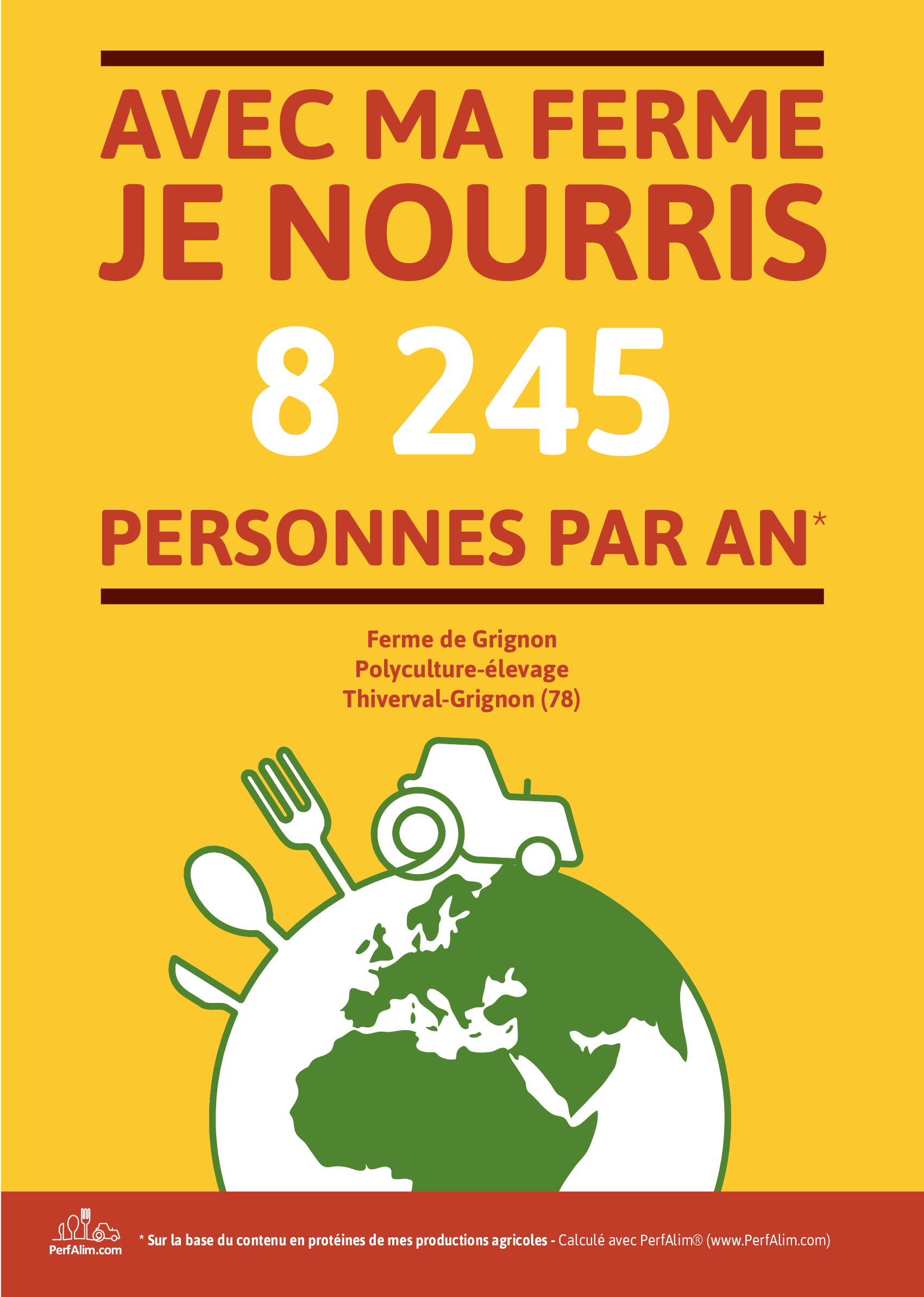 Communiquer auprès du grand public sur la fonction première de l’agriculture, souvent occultée aujourd’hui, qu’est sa fonction nourricière. Grâce aux visuels proposés, vous pourrez communiquer sur votre exploitation, dans les foires et salons, etc. La performance alimentaire permet de proposer une vision de l’agriculture plus nuancée que celle qui n’en retient souvent que l’impact sur l’environnement. C’est ainsi, que PerfAlim est utilisé pour calculer cet indicateur dans CAP2ER.
