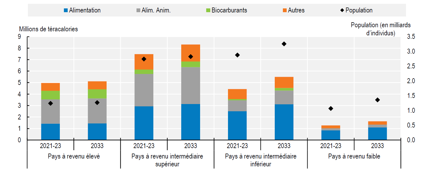 Dans le rapport Perspectives agricoles de l’OCDE et de la FAO 2024-2033, les deux institutions indiquent que durant la prochaine décennie, la consommation totale de produits agricoles et halieutiques (utilisés pour l’alimentation humaine et animale, pour la production de carburants et en tant que matières premières pour d’autres usages industriels) devrait s’accroître de 1,1 pour cent par an et presque toute la consommation supplémentaire prévue devrait être attribuable aux pays à revenu faible ou intermédiaire. L’alimentation humaine continuera de représenter la majeure partie de la demande de céréales, suivie de près par l’alimentation animale. En 2033, 41% de l’ensemble des céréales seront directement consommés par l’homme, tandis que 36 % seront utilisés pour les aliments pour animaux et que le reste sera transformé en biocarburants et autres produits industriels.