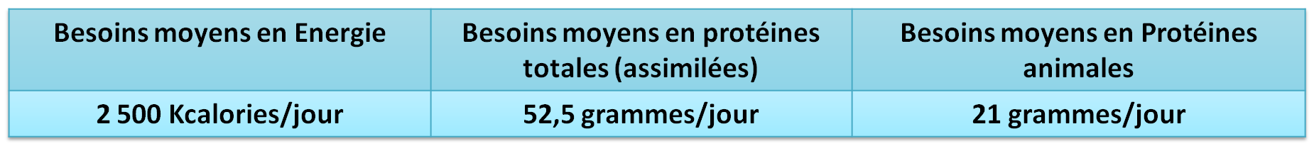 Le besoin de référence en énergie et protéines utilisé dans PerfAlim est la moyenne des besoins d’un homme jeune de 70Kg et d’une femme jeune de 55kg, ayant des activités physiques modérées. Il correspond à un besoin moyen quotidien de 2 350 kcal d’énergie et de 52.5 g de protéines réellement utilisables par l’organisme (protéines à haute digestibilité et de composition en acides aminées adéquat), soit un apport d’environ 60 g de protéines dite « totales » amenées par l’alimentation (on retrouve ici le coefficient d’efficacité nutritionnelle moyen, pour tous les aliments, estimé à 85%).